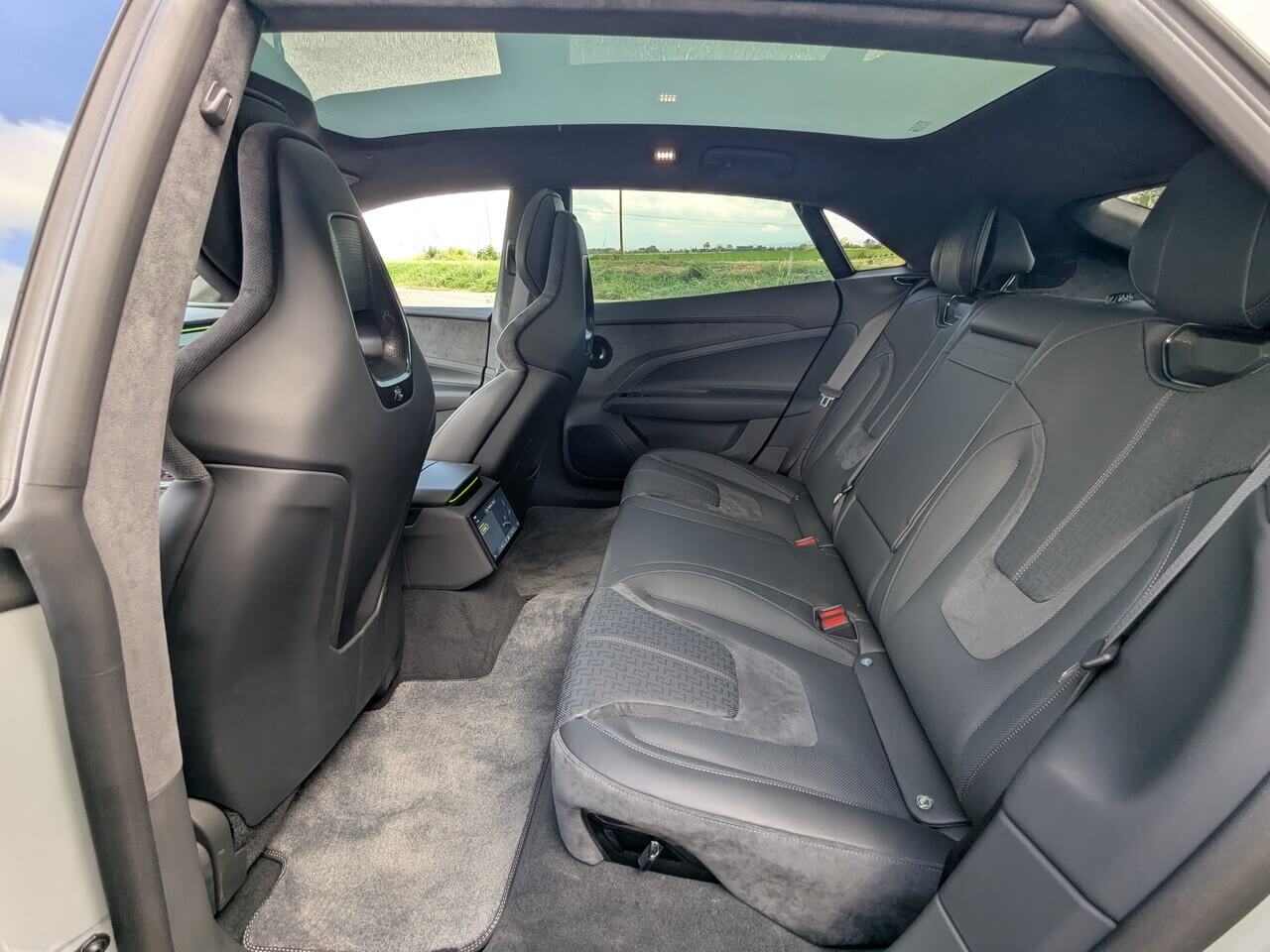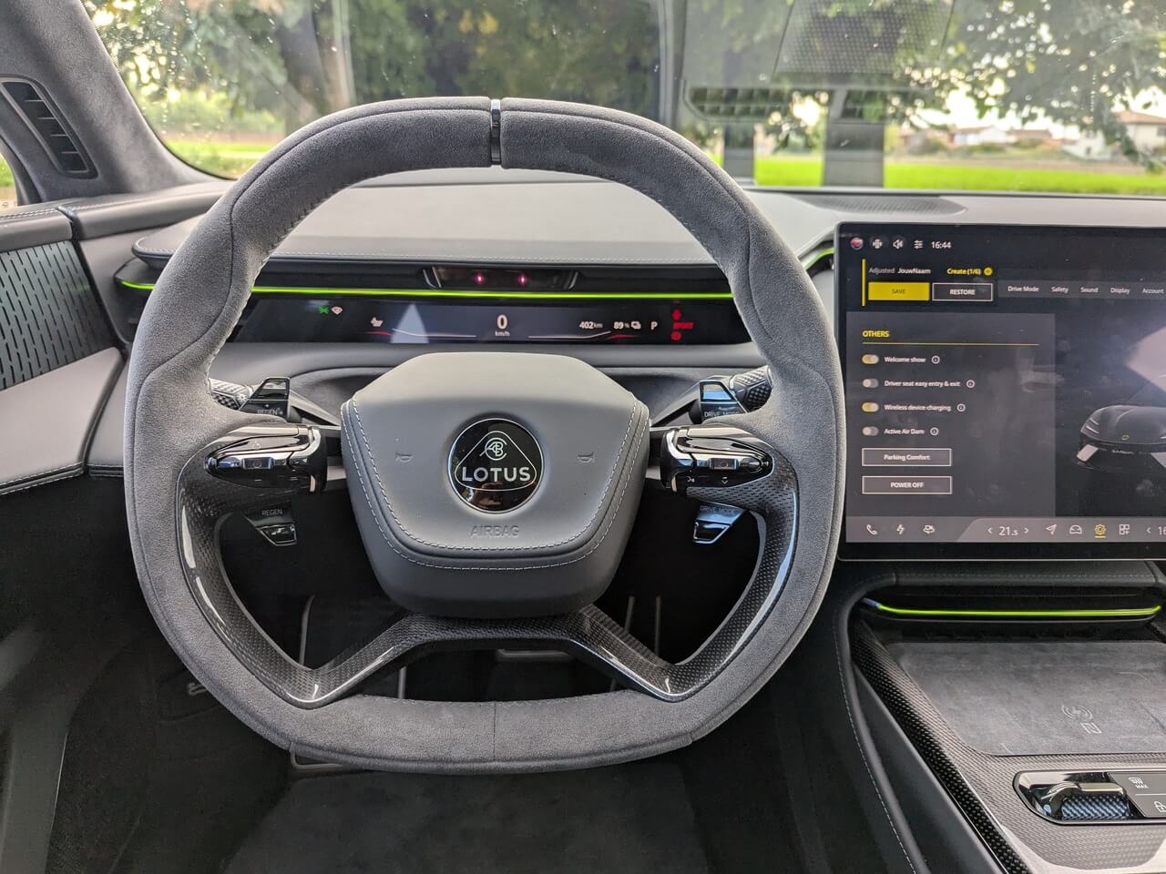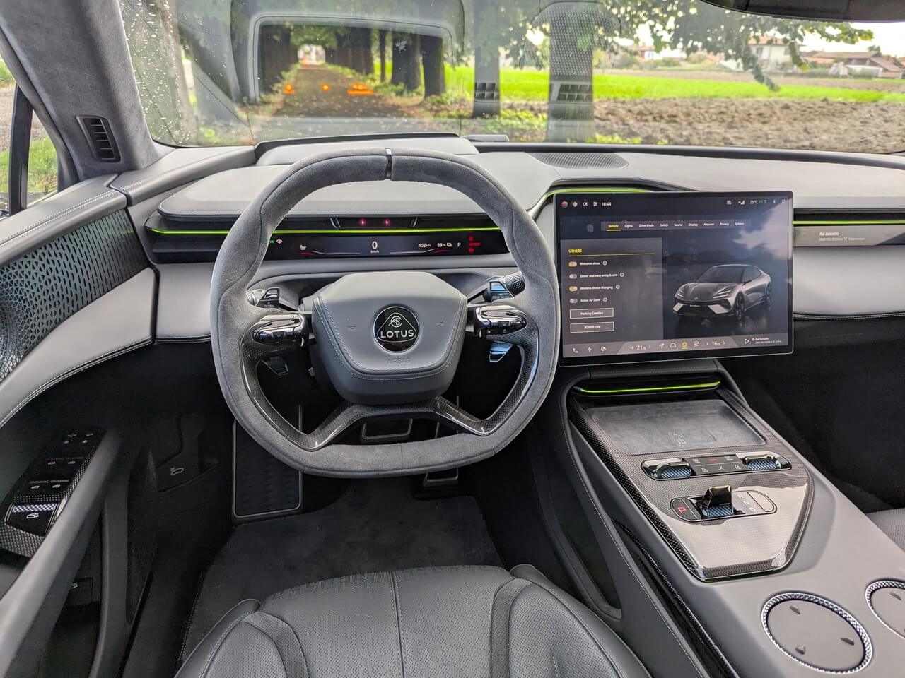 Serienmäßig ist Weiß als Außenfarbe verfügbar. Darüber hinaus bietet Lotus mehrere Sonderlackierungen mit Aufpreisen zwischen 1.550 und 2.250 Euro, darunter auch das Boreal-Grau des Testwagens. Optisch lässt sich der Emeya zusätzlich über verschiedene Felgendesigns individualisieren. Die glanzschwarzen Anbauteile sind optional auch in Carbon erhältlich. Außen gibt es zudem LED-Matrix-Scheinwerfer mit adaptivem Fahrlicht, Soft-Close-Türen, eine elektrische Heckklappe sowie ein Glasdach.