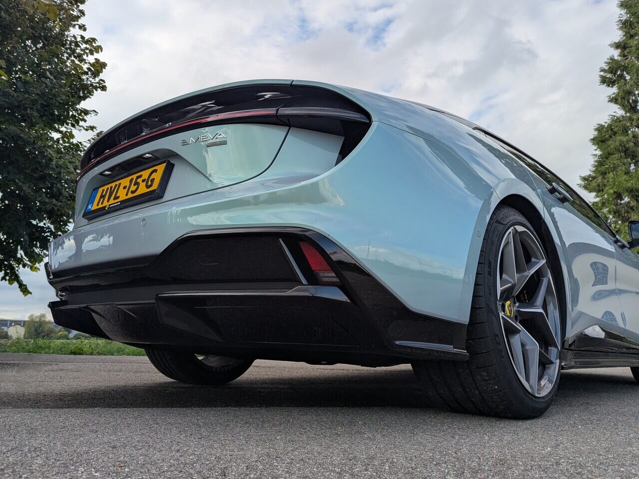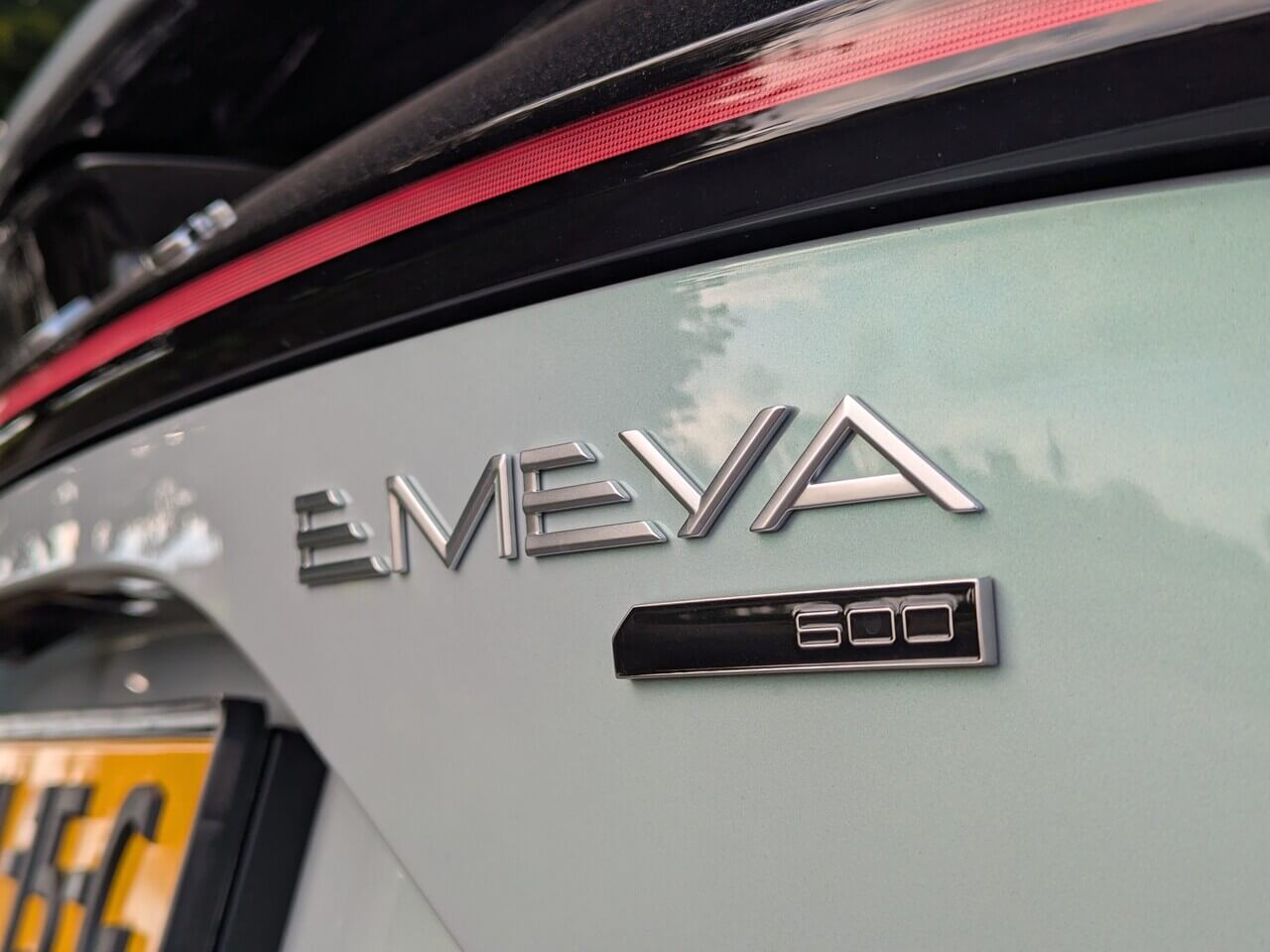 Aerodynamik spielt beim Emeya eine zentrale Rolle. Eine aktive Luftführung mit automatisch gesteuerten Klappen optimiert den Luftstrom je nach Fahrsituation. Auch die Türgriffe sind versenkbar ausgeführt. Am Heck sorgt ein elektrisch ausfahrbarer Spoiler bei höheren Geschwindigkeiten für zusätzlichen Anpressdruck. Schwarze Akzente an Dach und unteren Karosserieteilen lassen den Emeya optisch schlanker wirken.