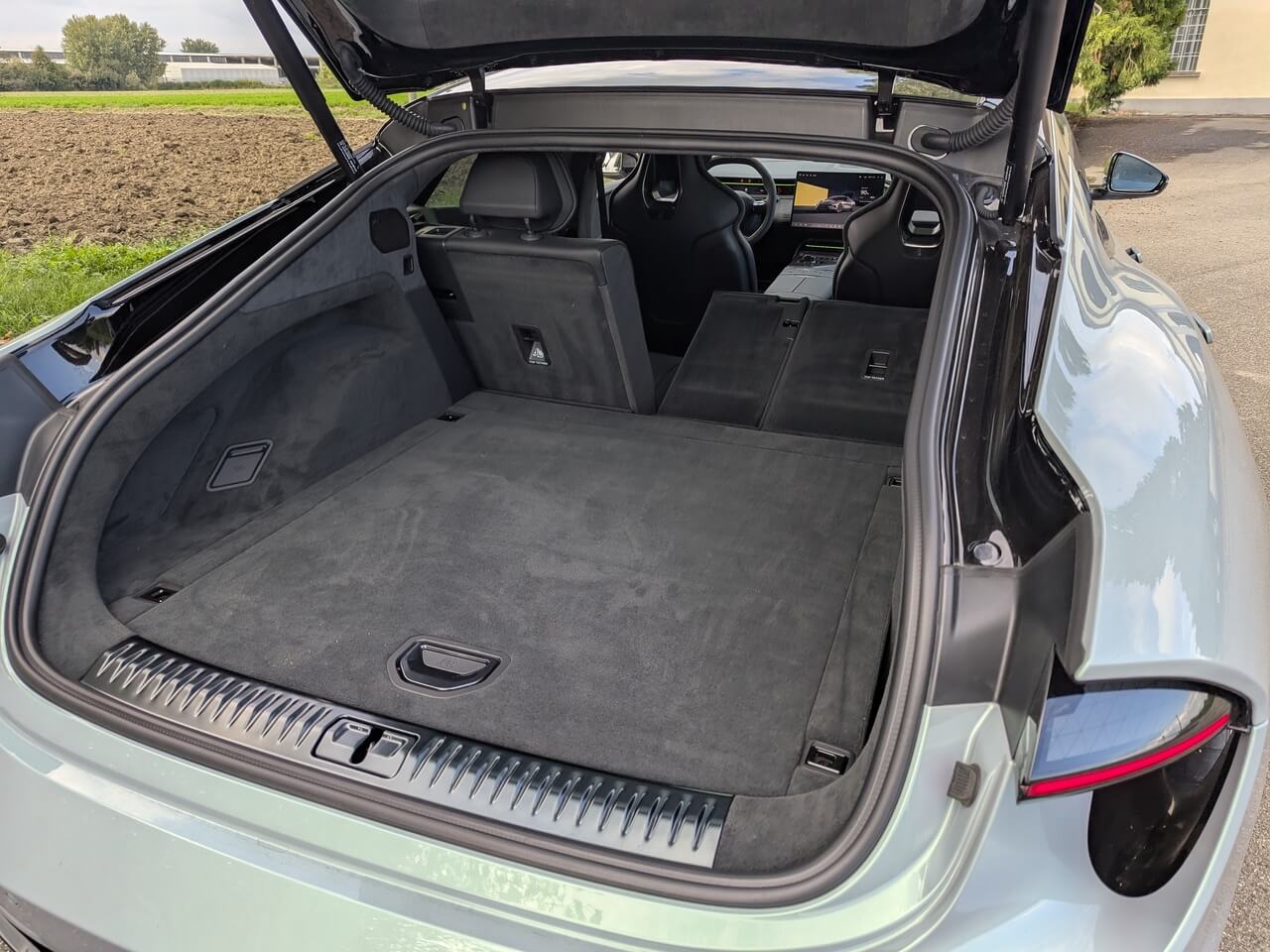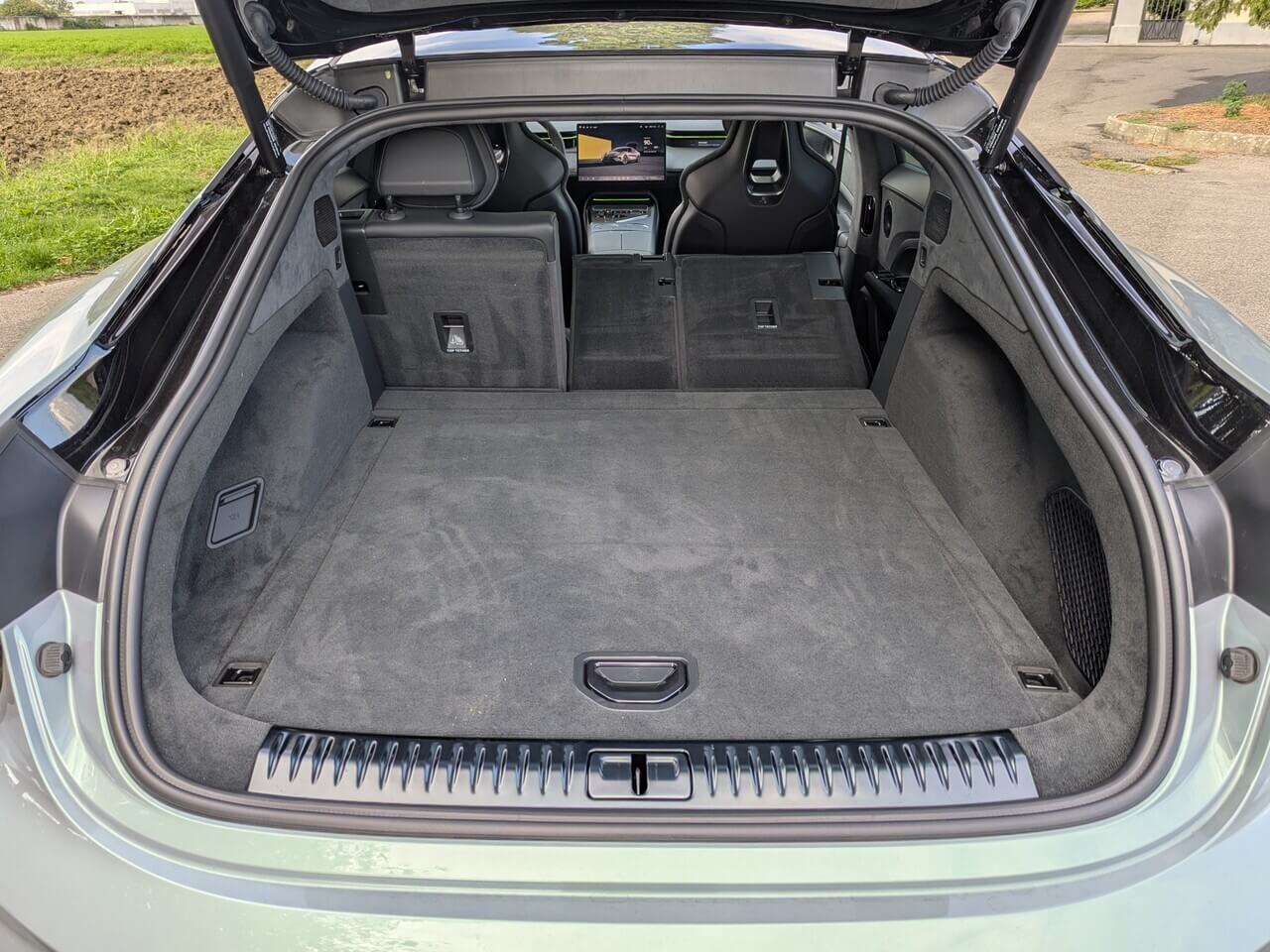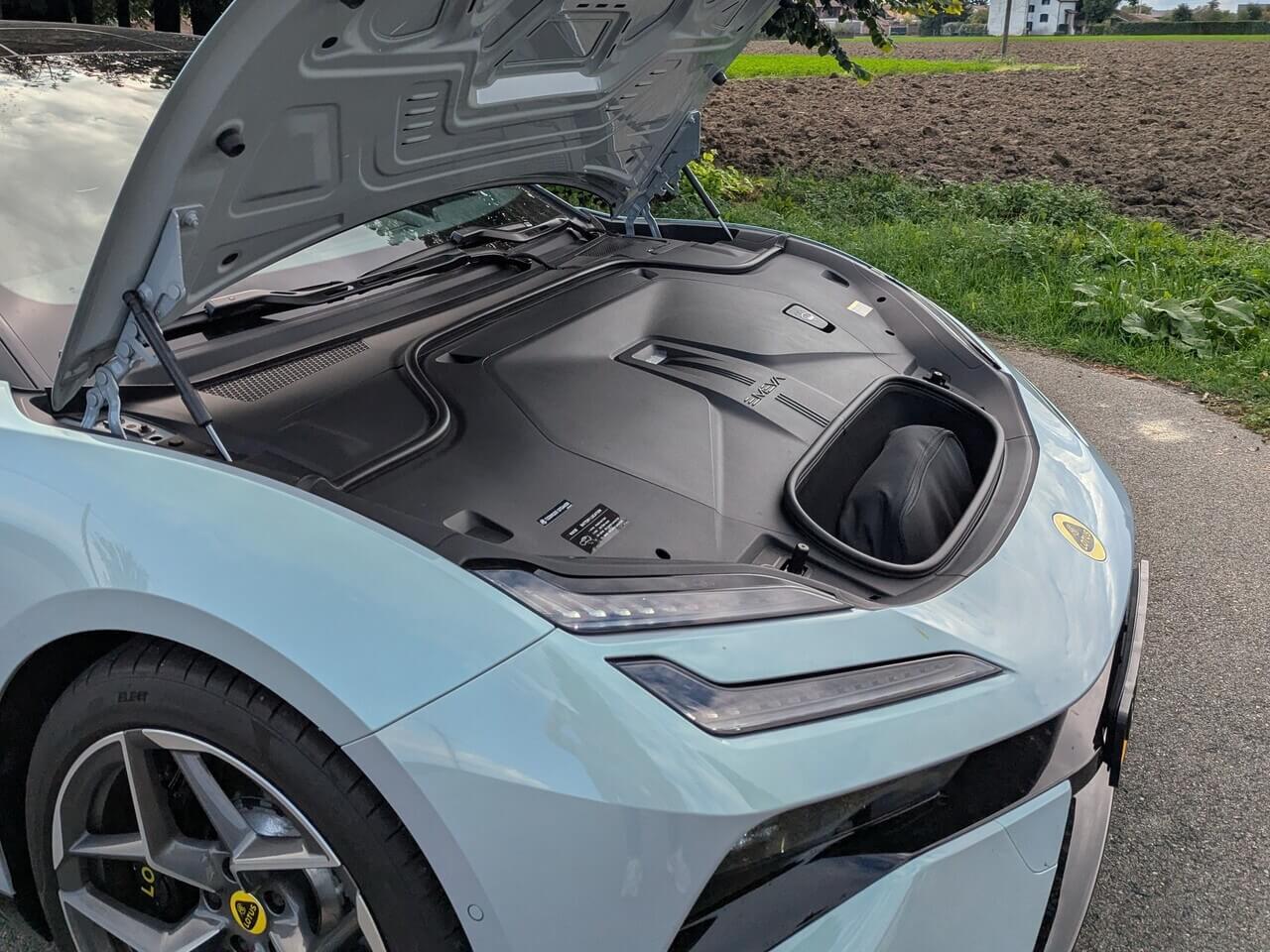 Zwar sieht dieser seiner gesamten Pracht groß aus, ist mit einem Fassungsvermögen von 509 Litern aber nur bedingt familientauglich. Der Kofferraum im e-Tron GT und Taycan sind jedoch noch kleiner. Wer aber längerer Gepäckstücke mitnehmen und auf die Plätze der hinteren Sitzreihe verzichten kann, kann diese umlegen und den Gepäckraum auf bis zu 1.388 Liter erweitern. Die Fernentriegelung zum Umlegen der Rücksitzlehnen mit Teilungsverhältnis 40:20:40 kann ganz bequem von der geöffneten Heckklappe gesteuert werden. Umgelegt entsteht eine übergangsfreie, leicht ansteigende Ladefläche. Es gibt ein herausnehmbares Gepäckrollo. Der Qualitätsanspruch von Lotus zeigt sich selbst beim Gepäckraum, der mit hochwertigem Teppich und Alcantara ausgekleidet ist.