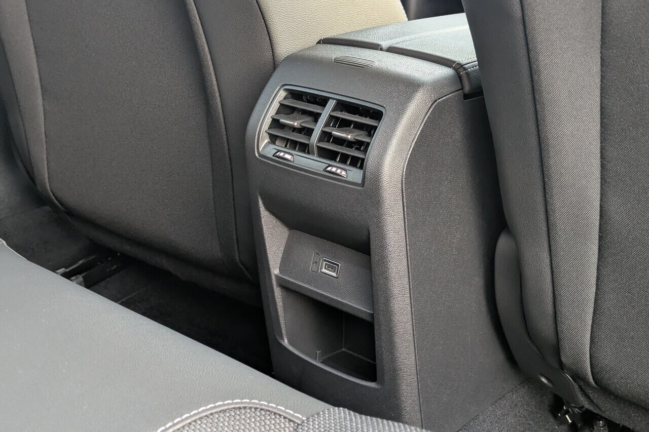 Die Platzverhältnisse hinten sind klassentechnisch gut. Es gibt eine runterklappbare Mittelarmlehne und einige Ablegemöglichektien in den Türtaschen, und den Vordersitzen, sowie der Mittelkonsole. Hier finden sich eigene Lüftungsdüsen und ein USB-C-Anschluss. Eine eigene Klimazone oder Sitzheizung für die Rücksitze sind leider nicht verfügbar.