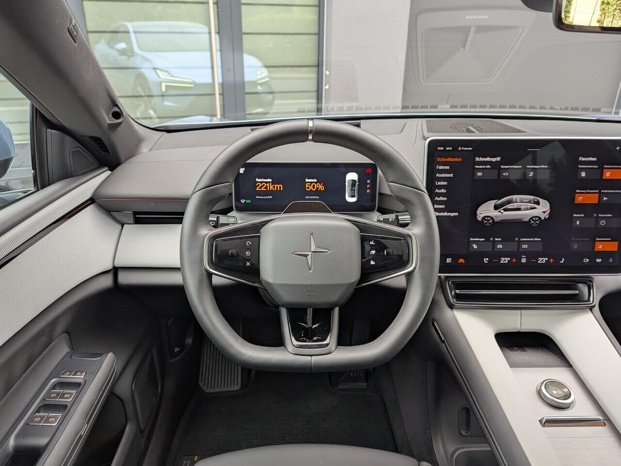 Das Bedienkonzept beim Polestar 4 simpel und sehr reduziert. Das fängt schon beim Schlüssel an. Knöpfe findet man hier nicht. Wann auf- und zugeschlossen wird, entscheidet das Auto selbst. In der Theorie hört sich das gut an, in der Praxis war das Timing nicht immer optimal. Bis die Türgriffe ausgefahren sind, hat es mir manchmal ein paar Sekunden zu lang gedauert. Dass es aber auch keinen Startknopf gibt, ist hingegen gelungen und klappt. Die Ladezeiten des Infotainmentsystems könnten etwas schneller sein. Hier braucht es manchmal etwas Zeit, bis das System hochgefahren ist.