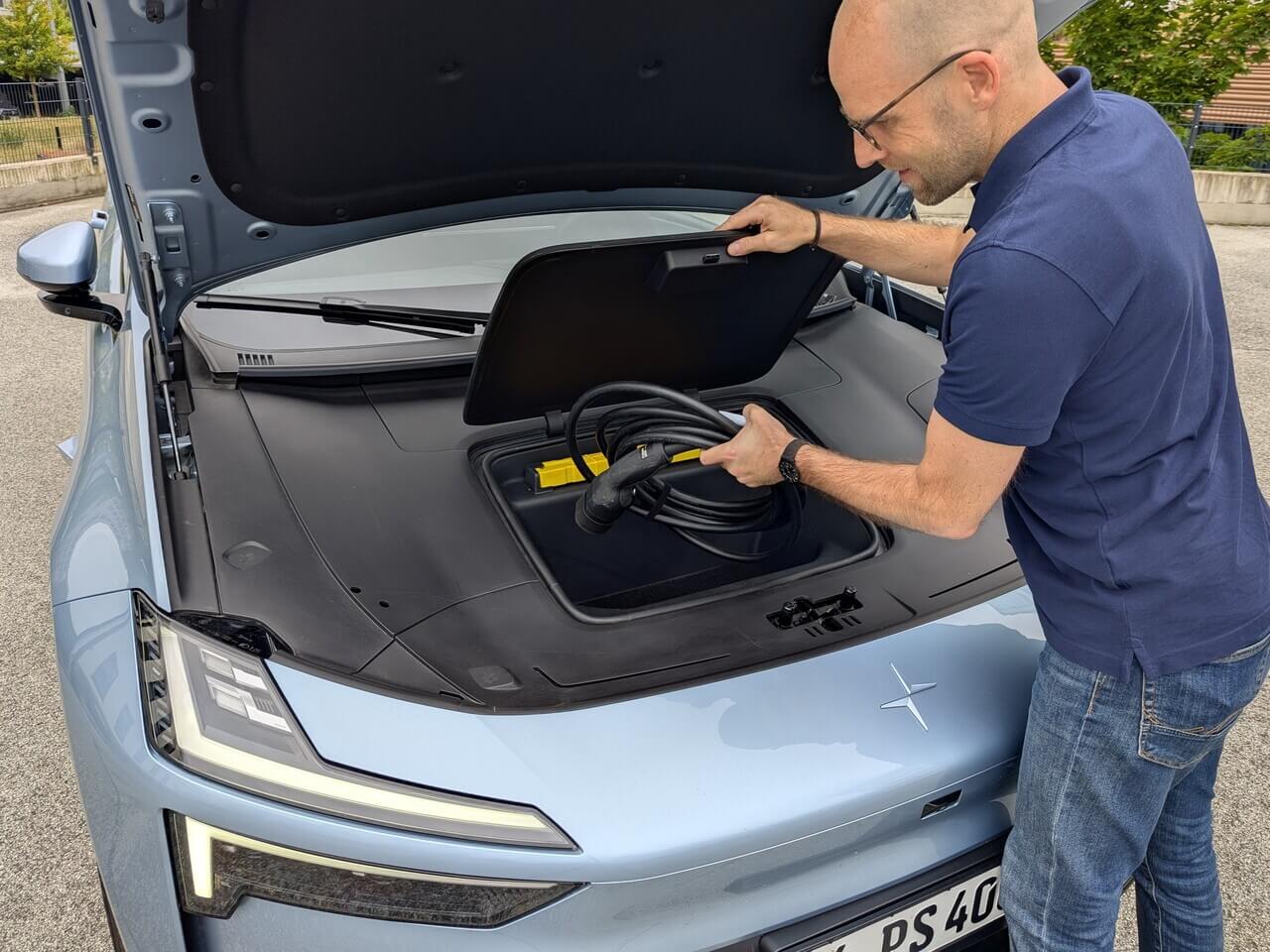 Ebenfalls sehr praktisch ist der Frunk, ein separates Staufach unter der Fronthaube. Mit 15 Litern Fassungsvermögen ist es zwar nicht riesig, eignet sich aber ideal für das Ladekabel. So bleibt das Kabel sauber und trocken, getrennt vom restlichen Gepäck. Besonders bei nassem oder dreckigem Kabel ein echter Vorteil.